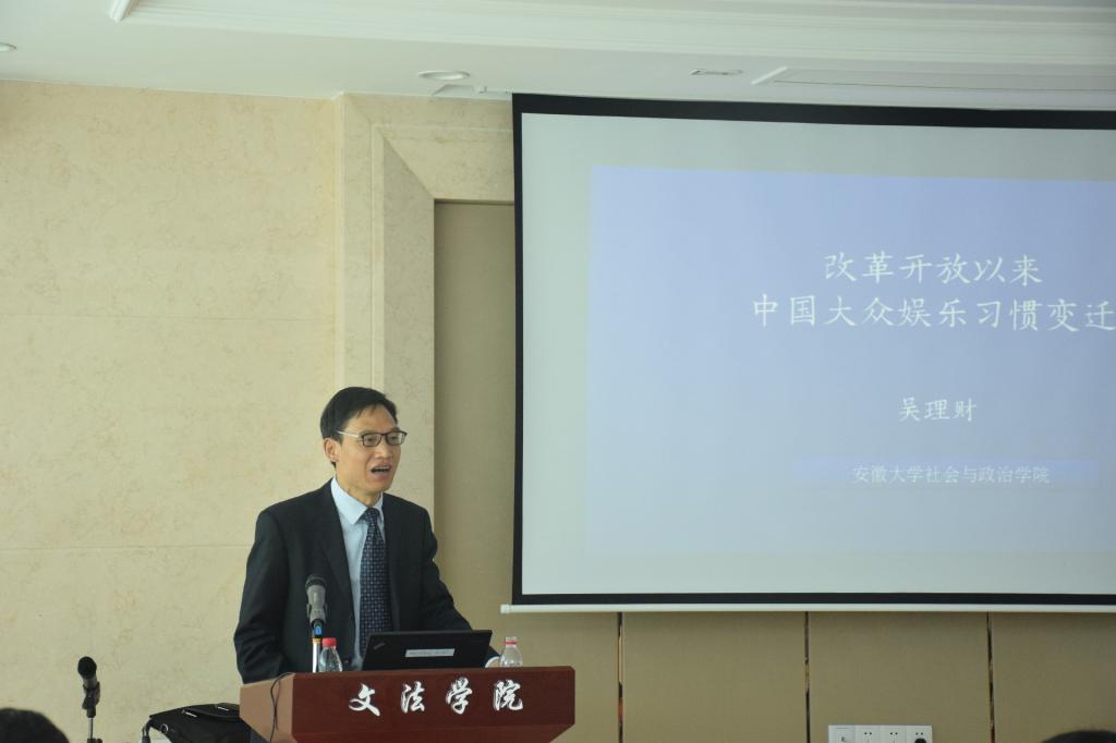 11月14日下午,安徽大学吴理财教授在人文楼M612做客我校狮子山社会学讲坛,作了题为“改革开放以来中国大众娱乐习惯变迁”的学术讲座,本次学术讲座由亚洲必赢bmw院长田北海教授主持。