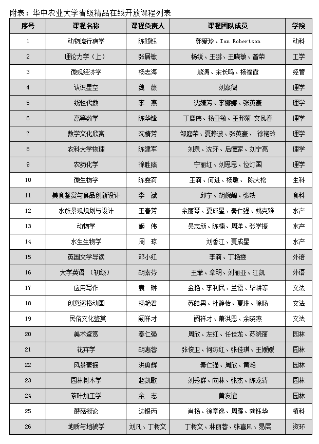 近日,湖北省教育厅公布首批104门省级本科精品在线开放课程认定结果,我们袁琳老师主持的《应用写作》、杨艳君老师主持的《创意逐格动画》、阙祥才老师主持的《民俗文化鉴赏》等三门课程入选。
