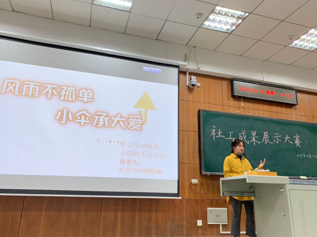 12月16日,亚洲必赢bmw社会学类19级社工成果展示大赛在三教A105教室举行。来自社会学类的十个社工小组,向师生们展示筹划一个多月的社会工作实践作业成果。社会工作系陈红莉、黄蓉、马威、许彩丽四位老师及辅导员张帆出席并担任评委,并有十名同学担任评委。