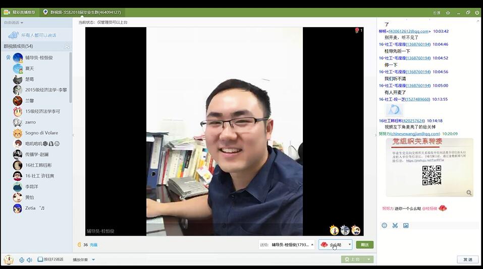 (通讯员 徐张军)5月19日上午,一场别开生面的毕业生毕业派遣政策宣讲会顺利举办,我们研究生辅导员桂恒俊老师开通QQ视频网络直播为所有的应届毕业生详细介绍研究生毕业派遣政策。