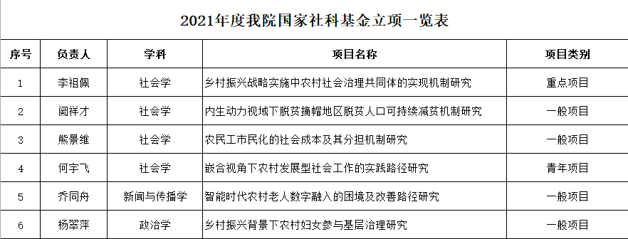 近日,全国哲学社会科学工作办公室公布了2021年国家社科基金年度项目和青年项目立项结果,我校共有16个项目获得资助,我们占有6项,其中唯一1项重点项目由我们李祖佩老师贡献。