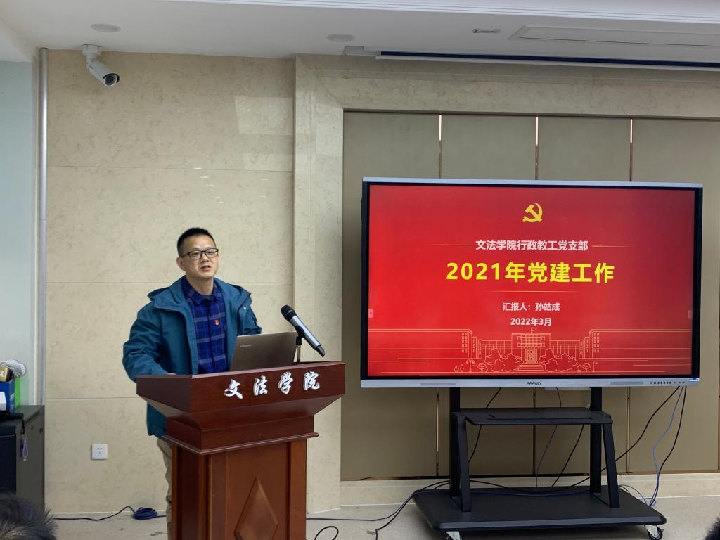 行政教工党支部书记孙站成介绍了支部坚持“党建+服务”融合发展理念,以建党100周年暨党史学习教育为主线,以“我为师生办实事”为落脚点,用实际行动助推学院核心工作有序进行。