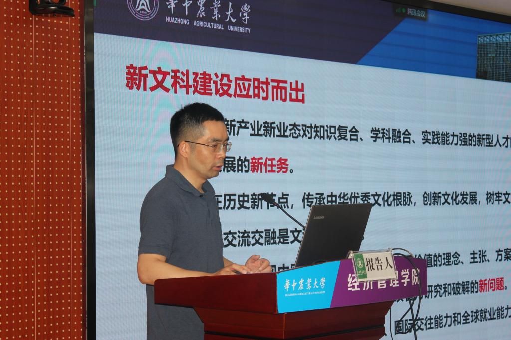 罗小锋教授结合经管学院新文科建设的案例,详细列举了学院四个方面的举措。一是做好课程思政,建设古今融通的文化自信培养体系;二是注重知识复合,建设文理融通的专业课程体系;三是强化创新实践,建设理实融通的实践创新能力培养体系;四是推进国际合作,建设中外融通的全球胜任能力提升体系。