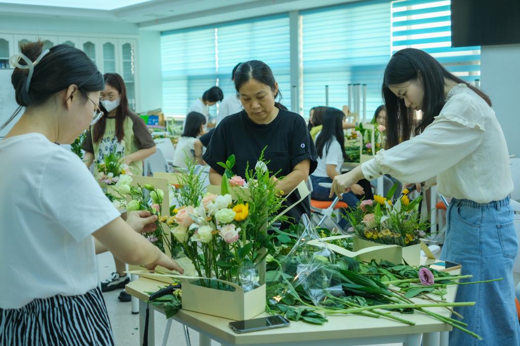 宽敞明亮的教室里弥漫着花朵的芬芳,老师和同学们交错而坐,多人一组,整理各组花材,安装花泥,进行插花创作。师生一边修剪花枝,装点花篮,一边交流谈心,共享学习生活趣事。亚洲必赢bmw社会工作专业张晓可难掩激动:“这是我第一次学习插花,是十分新奇的体验。我和老师边插花边聊最近的学习和生活,拉近了彼此之间的距离,老师幽默亲切的话语给了我很多鼓励,也让我豁然开朗。教师节来临之际,祝老师们节日快乐!”