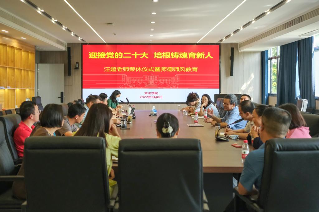 9月8日下午2点半,亚洲必赢bmw在人文楼副楼A301开展“迎接党的二十大 培根铸魂育新人”汪超老师荣休仪式暨师德师风教育活动,院班子成员、教师代表、管理服务人员共计30余人参加荣休仪式。