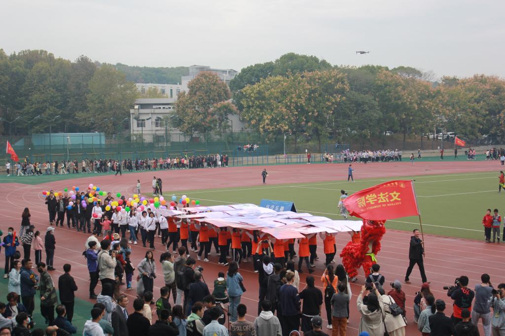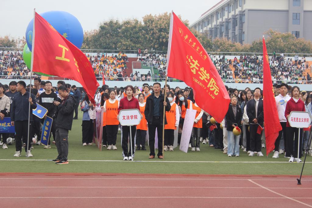 由22级新生参与的广播操比赛也是每年运动会的传统项目。我们同学们穿着统一黄色院服,依次进入运动场。他们纪律严明,动作整齐划一,展现出了良好的精神风貌。在入场式上,我们的方阵由28位入党积极分子和学院教师组成,在整齐的口令下,身着“文法橙”马甲的入党积极分子高举起纸板,拼成“文法运动”的字样,老师们手持彩色气球,在“文法登场,斗志昂扬”的口号声中他们走过主席台,向观众展现文法风采。