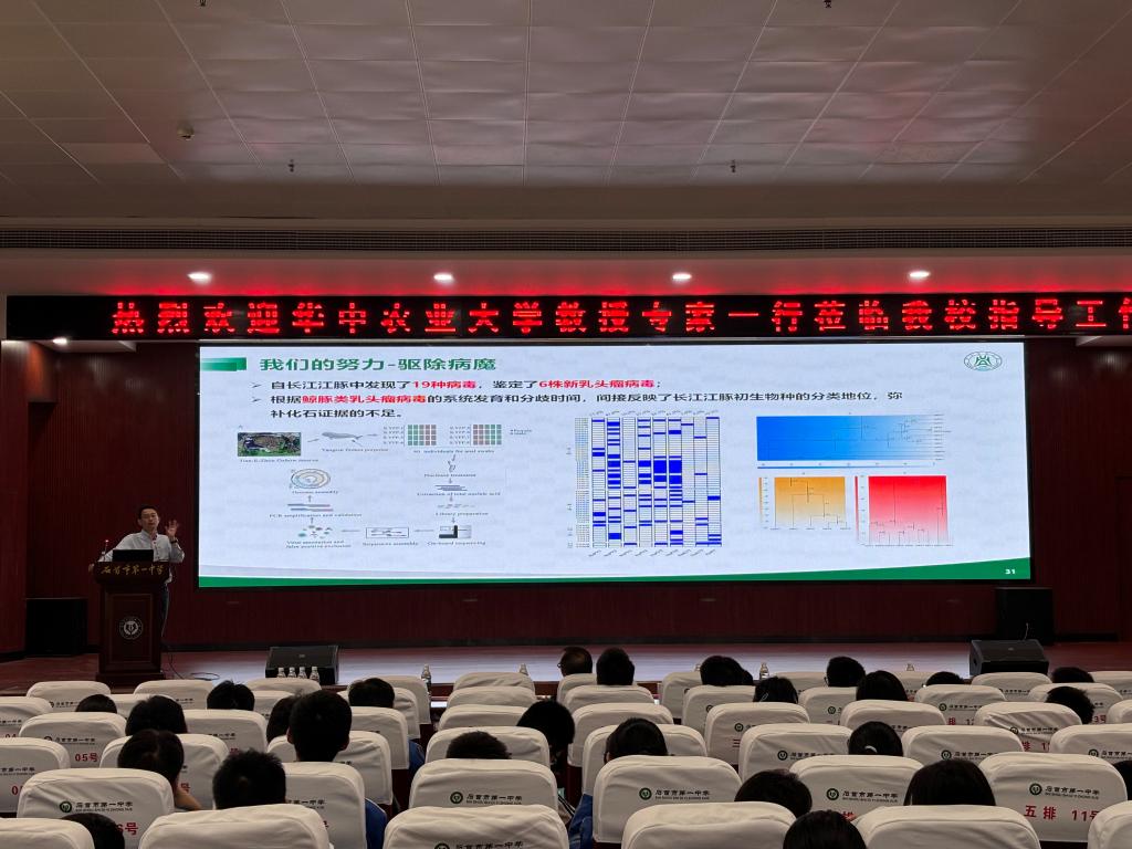 “江豚为什么被称为微笑天使?”在石首市第一中学,袁军法开场便向同学们抛出问题,随后他从长江江豚的外形特征、栖息环境和食物来源等几个方面向同学们科普了江豚的基本特点。谈及江豚的保护现状,袁军法介绍了石首天鹅洲白鳍豚国家级自然保护区的饲养员丁泽良的先进事迹。丁泽良原本是长江边捕鱼为生的普通渔民,从2008年第一次救助江豚开始,十六年如一日,他一门心思投入江豚的保护与饲养过程中,成为保护区里名副其实的江豚“奶爸”。“江豚的保护不是一朝一夕的事情,需要有更多像丁叔叔这样的环保者接续努力”,最后,袁军法勉励同学们要保护长江环境,共同留住长江的“微笑天使”。