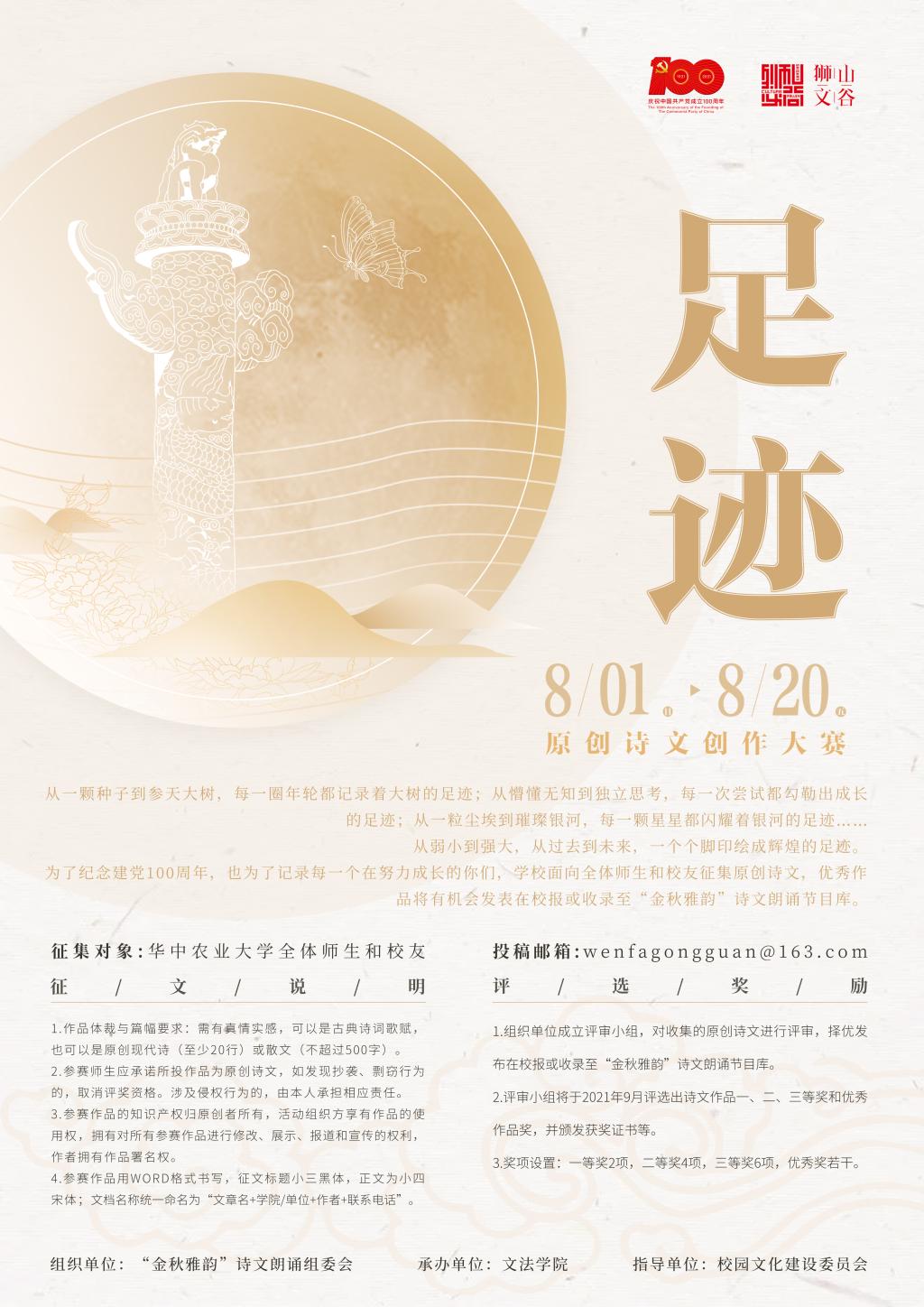 为了纪念建党100周年,也为了记录每一个在努力成长的你们,学校面向全体师生和校友征集原创诗文,优秀作品将有机会发表在校报或收录至“金秋雅韵”诗文朗诵节目库。