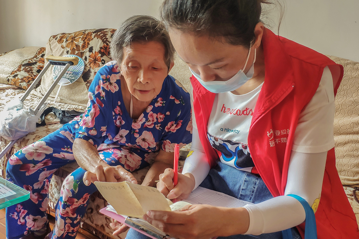 有一位70岁的受助老人,半身不遂,身边无儿无女,妻子与他守望相助八年。这是吕奥上门走访慰问的第一位老人。当谈及身体状况时,老人紧紧握住老伴的双手,眼角泛出泪花,心中的感激不言而喻。这八年来,妻子全心全意照顾着老人的生活起居,虽偶有怨言但始终不离不弃。志愿者们也为此动容,吕奥详细记录好老人的家庭情况,方便后续社区工作人员对老人提供关照与帮助,并提醒老人做好消暑措施,注意身体健康。
