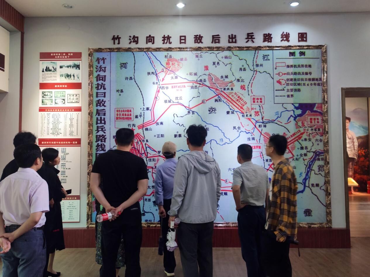 走出烈士陵园,老师和同学们来到竹沟革命纪念馆。这座纪念馆始建于1956年,由周恩来题写馆名。是全国建立较早的革命纪念馆之一。馆内有革命旧址31处,文物、文献、图片等近千件,是全国重点文物保护单位。展厅共分六大部分:第一部分为“早期革命活动”;第二部分是“开辟豫南桐柏山区根据地”;第三部分是“河南抗战的领导中心”;第四部分为“中原抗战的战略支撑点”;第五部分是“竹沟惨案”;第六部分为“夺取抗战的最后胜利”。